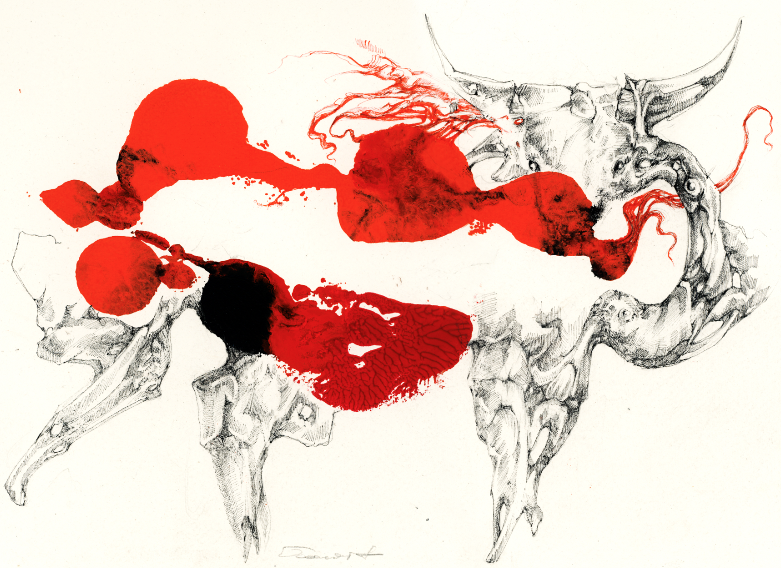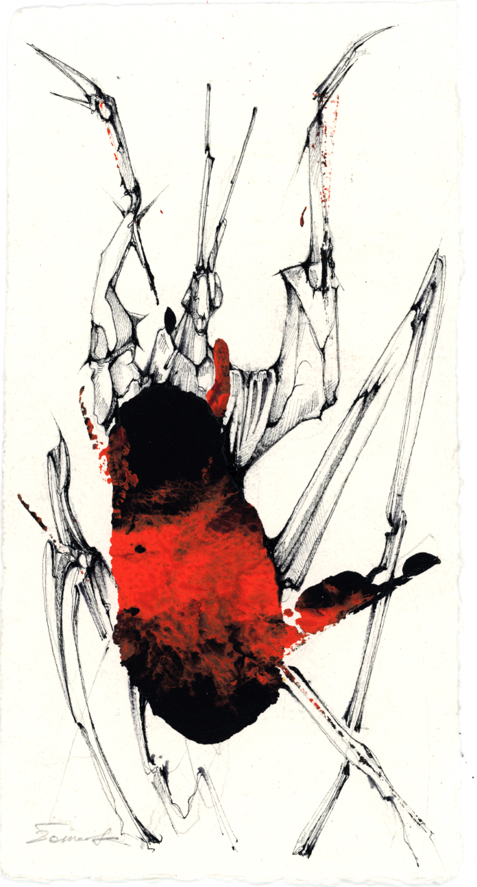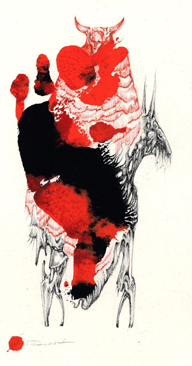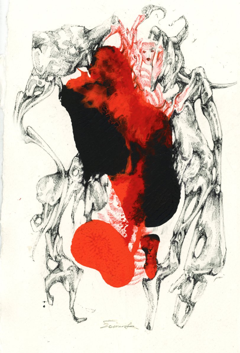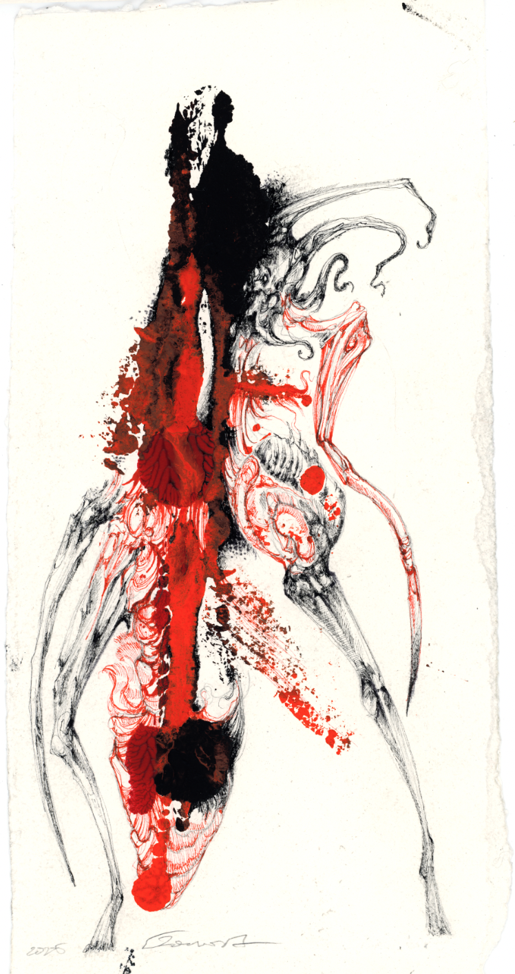 Ink and graphite drawing on handmade paper.
